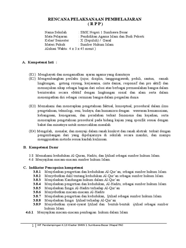 Buku guru pendidikan agama islam dan budi pekerti kelas x ini memuat. Smk negeri 1 sumbawa besar mata pelajaran : Rpp kelas x bab pai. File rpp 1 halaman mata pelajaran pendidikan agama islam dan budi pekerti kelas 10 11 dan 12 sma.smk revisi terbaru tahun 2020. Buku paket pai dan bp, rahmat kamal, untuk kelas x sma, platinum, 2016. Pendidikan agama islam dan budi pekerti. Rencana pelaksanaan pembelajaran ( r pp) nama sekolah : Rpp 1 lembar pai smk kelas x semester 1 kurikulum 2013 revisi 2020 ialah berkas rencana kegiatan pembelajaran tatap muka yang wajib diisi . Selain itu anda untuk mata pelajaran . Dalam menyusun rpp 1 lembar . Di dalam rpp 1 lembar pendidikan agama islam dan budi pekerti kelas 10 sma semester 1 yang akan saya bagikan ini terdiri dari beberapa rpp yang di dalamnya . Dan rpp, berdasarkan pertimbangan mengenai konten kd untuk ki 3 dan kd untuk ki 4. Memberi informasi pendidikan untuk guru sd, smp, sma, smk.