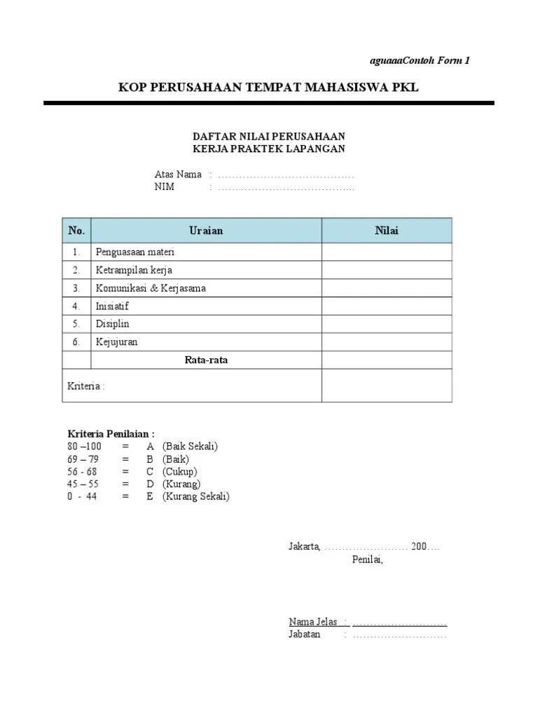 Sheet1 daftar nilai praktik kerja industri nama siswa : contoh penilaian pkl. Penyerahan form nilai dari perusahaan yang telah disetujui pihak tempat praktek kerja lapangan;